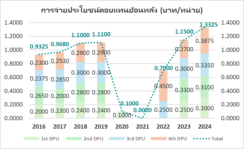 | วันที่คณะกรรมการมีมติ | วันที่ขึ้นเครื่องหมายXD | วันที่จ่าย | เงินประโยชน์ตอบแทน (บาท/หน่วย) | รอบผลประกอบการ |